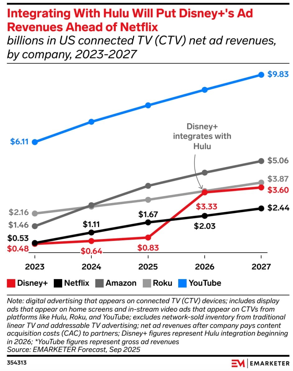 繼任者將接手一個充滿挑戰的局面,執行 600 億美元的樂園擴張、重振漫威與星際大戰系列、提升 Disney+ 利潤率並應對一般電視的衰退。根據 eMarketer 預測,Disney+ 廣告營收將大幅成長至 14.2 億美元,成為串流廣告成長主力,整合 Hulu 後的總營收甚至將超越 Netflix。然而,Hulu 與 Disney+ 的訂閱營收成長雖可期,但力道將逐漸放緩。因此,下一任 CEO 必須在推動樂園完美執行、提升串流變現能力以及重振電影品牌之間取得平衡。這項繼任決定不僅關乎人選,更定調了Disney 在競爭激烈的媒體娛樂版圖中,如何平衡創意、紀律與經濟效益的未來走向。(by Jeremy)