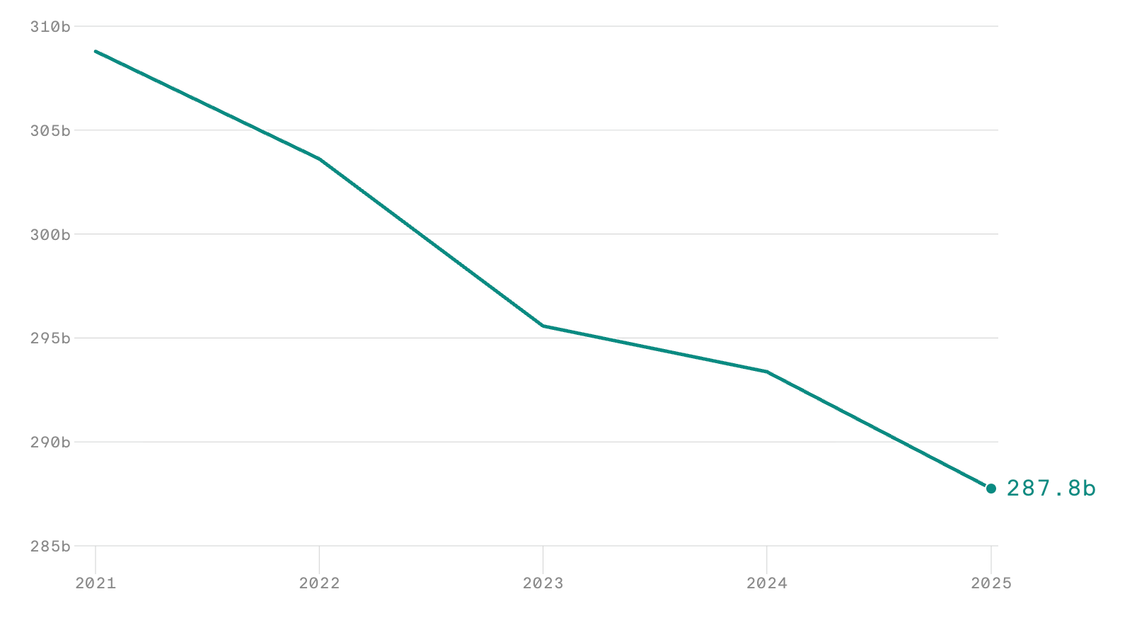 然而如果我們只關注全球前 1,000 大網站的月均流量,在過去 5 年大致維持在約 3,000 億次,甚至在 2024 年 11 月至 2025 年 11 月間還出現約 1.8% 的小幅成長。