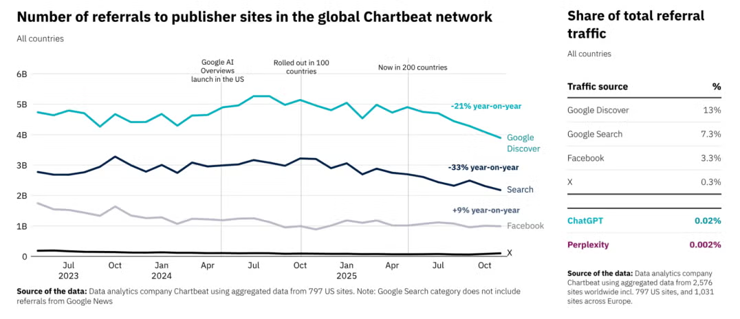 最新由 Reuters Institute for the Study of Journalism 發佈的 2026 年趨勢報告顯示,2025 年全球媒體網站從 Google 搜尋與 Discover 的引用流量較前年(2024)同期大約下滑三成,美國市場的下跌幅度甚至更高。下降主因被歸因於搜尋引擎中 AI 摘要與對話式結果的普及,使得使用者在搜尋結果頁停留並獲得答案,而非點擊前往原始內容。